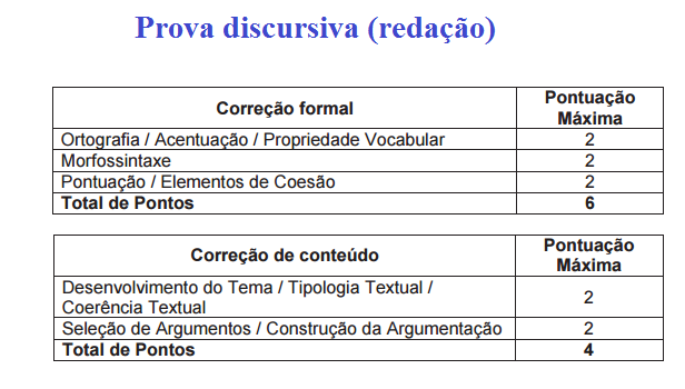 Já a prova discursiva (redação) será composta dos seguintes critérios e conteúdos: