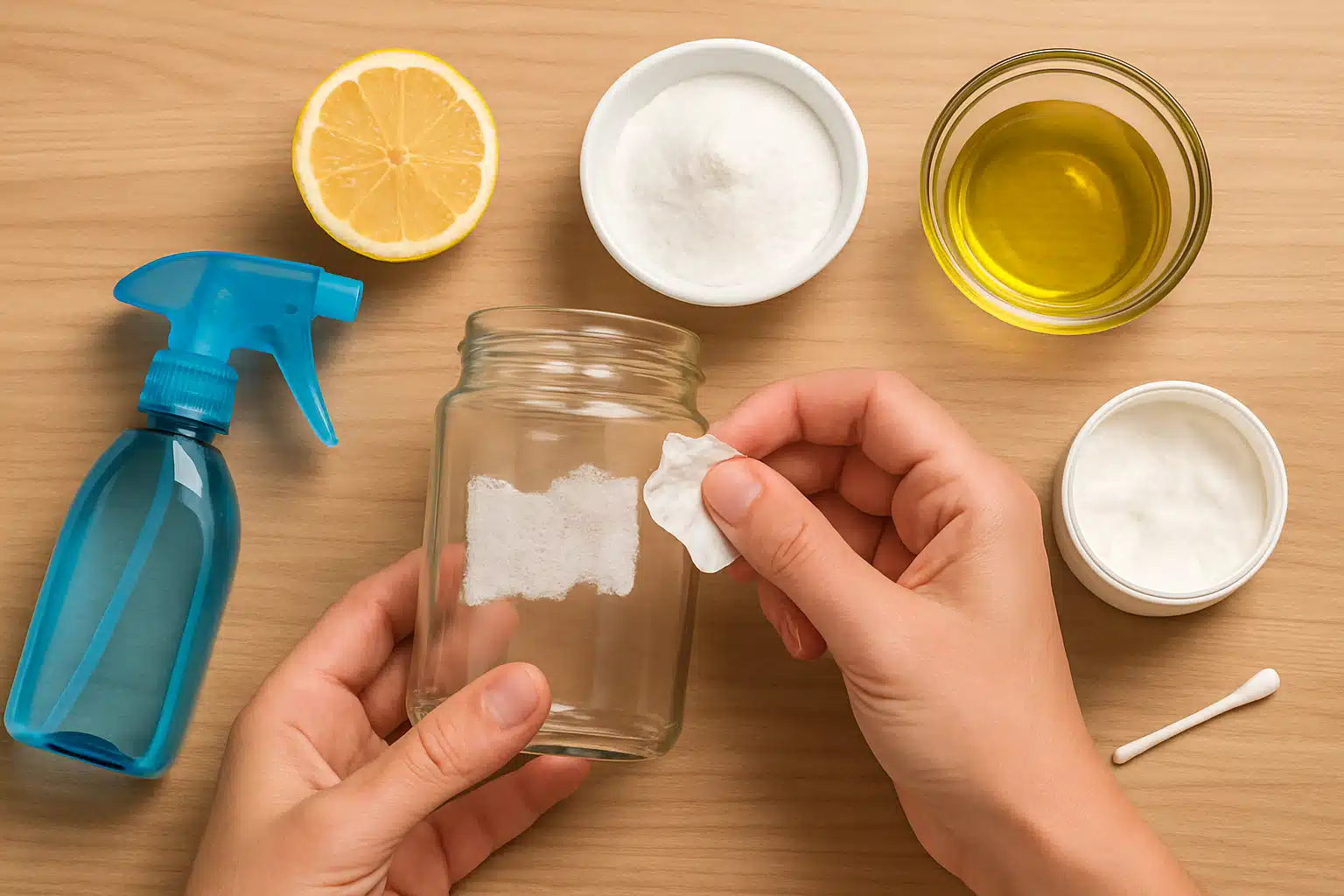 Para etiquetas mais resistentes, a combinação de bicarbonato de sódio com óleo de cozinha cria uma pasta potente. O bicarbonato tem ação abrasiva suave, enquanto o óleo ajuda a desprender a cola do vidro.
