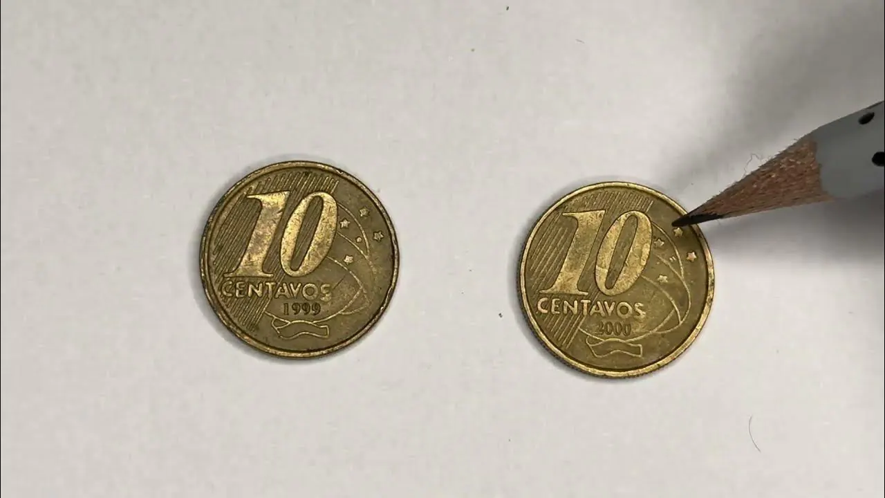 Essa, aliás, é uma característica que também foi catalogada em moedas de 10 centavos de outros anos. Veja abaixo: