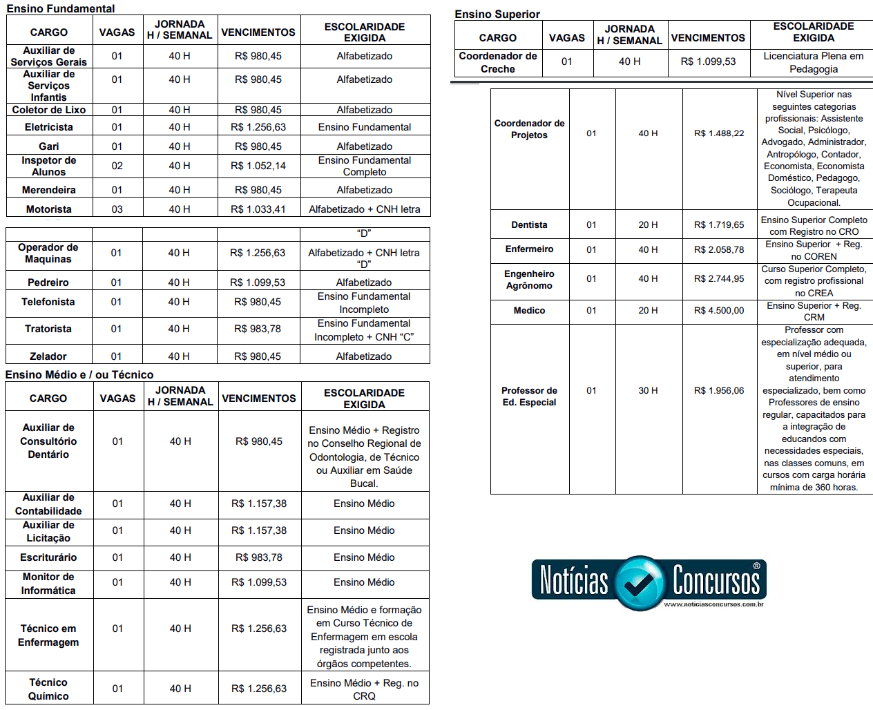 De acordo com o edital de concurso de Taiaçu-SP, as vagas serão destinadas aos cargos de Coordenador de Creche (1 vaga), Coordenador de Projetos (1 vaga), Dentista (1 vaga), Enfermeiro (1 vaga), Engenheiro Agrônomo (1 vaga), Médico (1 vaga), Professor de Educação Especial (1 vaga), Auxiliar de Consultório Dentário (1 vaga), Auxiliar de Contabilidade (1 vaga), Auxiliar de Licitação (1 vaga), Escriturário (1 vaga), Técnico em Enfermagem (1 vaga), Técnico Químico (1 vaga), Auxiliar de Serviços Gerais (1 vaga), Serviços Infantis (1 vaga), Coletor de Lixo (1 vaga), Eletricista (1 vaga), Gari (1 vaga), Inspetor de Alunos (2 vagas), Merendeira (1 vaga), Motorista (3 vagas), Operador de Máquinas (1 vaga), Pedreiro (1 vaga), Telefonista (1 vaga), Tratorista (1 vaga) e Zelador (1 vaga). Veja como realizar a sua inscrição a seguir.