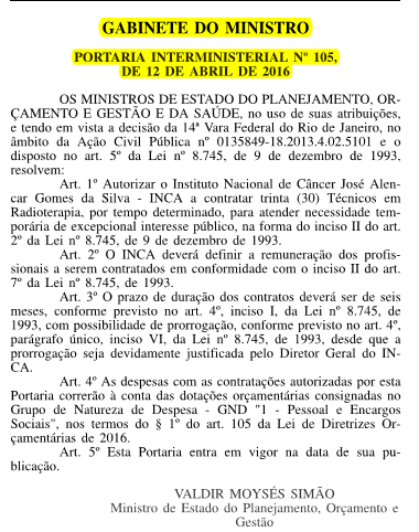 Boa notícia! Foi divulgado no Diário Oficial da União, a autorização do concurso do Instituto Nacional de Câncer José Alencar Gomes da Silva (INCA). A Portaria qua autoriza a seleção é a de nº105 (confira abaixo), que tem como objetivo o provimento de contração de 30 novos profissionais, na função de Técnico em Radioterapia, por tempo determinado, para atender necessidade temporária de excepcional interesse público.