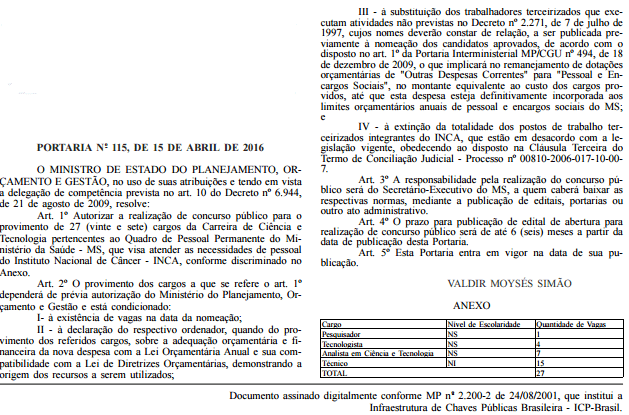 Foram 27 vagas autorizadas, no intuito de preencher as oportunidades na carreira de Ciência e Tecnologia vinculada ao Instituto Nacional de Câncer (Inca). As chances são para os cargos de pesquisador (1), tecnologista (4), analista em ciência e tecnologia (7) e técnico (15).