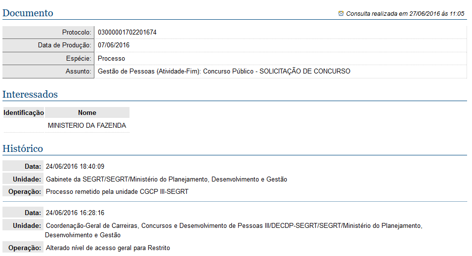 Apesar das suspensão dos concursos públicos federais, a Receita Federal não crê na devolução de seu pedido de concurso, protocolado junto ao Ministério do Planejamento, Orçamento e Gestão (MPOG) em 07 de junho deste ano. E parece que as previsões do órgão não estão sendo falhas. Isso porque, na última sexta-feira, 24 de junho, o pedido de concurso recebeu um grande avanço na pasta do MPOG (veja abaixo).