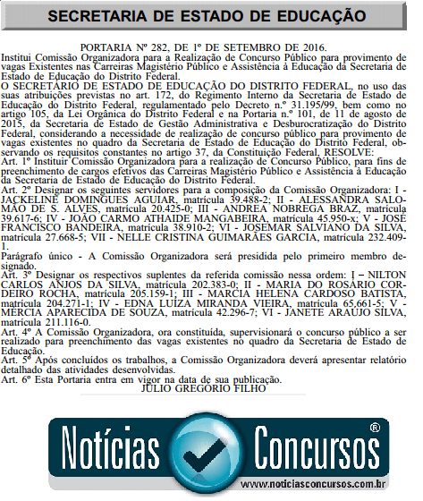 O edital de concurso público da Secretaria de Educação do Distrito Federal (Concurso SEDF) será publicado a qualquer momento. De acordo com uma publicação (veja abaixo) no Diário Oficial do DF desta segunda-feira, 05 de setembro, foi estabelecida uma Comissão Organizadora para a Realização de Concurso Público para provimento de vagas Existentes nas Carreiras Magistério Público e Assistência à Educação da Secretaria de Estado de Educação do Distrito Federal.