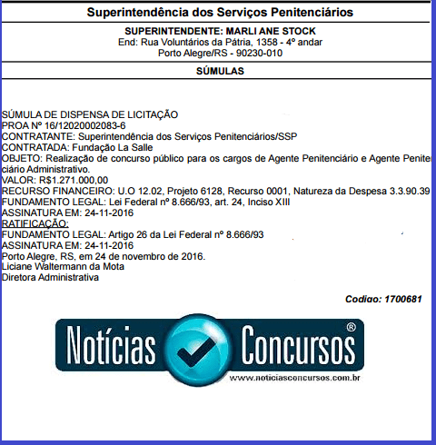 Foi divulgado no Diário Oficial do Estado desta sexta-feira, 25 de novembro, a organizadora do próximo concurso público da Superintendência de Serviços Penitenciários do Estado do Rio Grande do Sul (Concurso SUSEPE RS 2017). Trata-se da Fundação La Salle, que terá missão de organizar o certame para Agente Penitenciário e Agente Penitenciário Administrativo, com requisito de nível superior e médio, respectivamente. O edital terá 700 vagas.