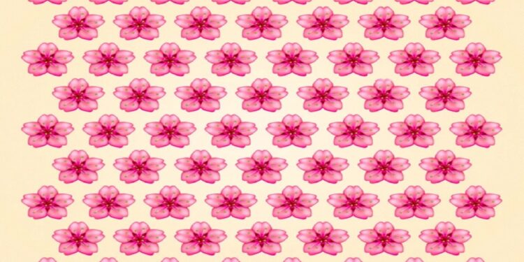 Prepare-se para o desafio de hoje que vai testar sua percepção! A imagem mostra um padrão repetido de flores de cerejeira cor-de-rosa, organizadas em fileiras regulares sobre um fundo bege claro. Você consegue encontrar em até 25 segundos a flor diferente nesta imagem?