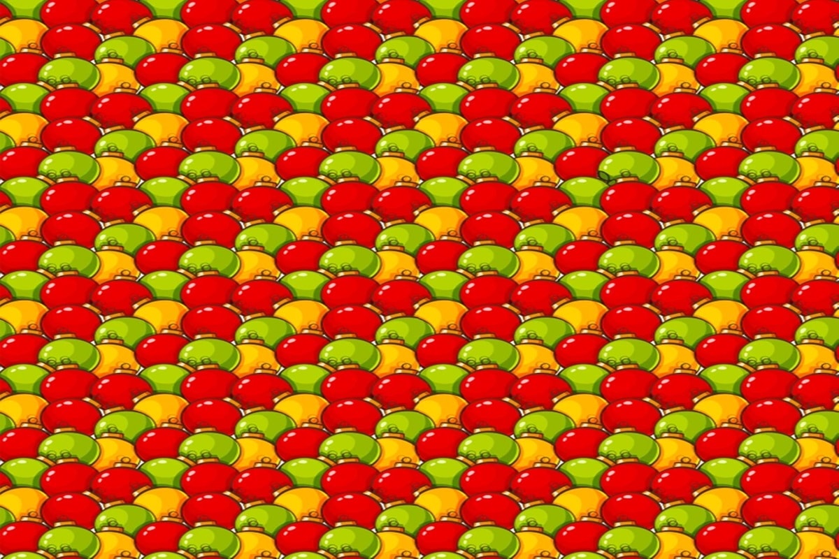 Prepare-se para o desafio de hoje que vai testar sua percepção! Uma imagem com um padrão gráfico de bolas de natal nas cores vermelho, verde e amarelo, organizadas em repetição contínua para criar um efeito visual. Você consegue encontrar em até 30 segundos a maçã camuflada entre as bolas de natal nesta imagem?