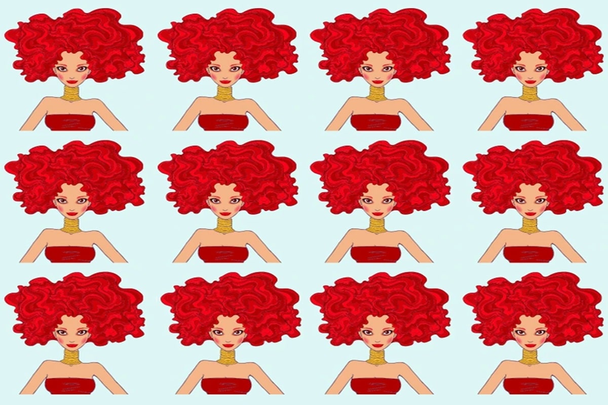 Prepare-se para o desafio de hoje que vai testar sua percepção! Observe atentamente a imagem que apresenta doze ilustrações de uma mulher com cabelos cacheados e volumosos na cor vermelha, vestindo um vestido vermelho e usando um colar dourado.