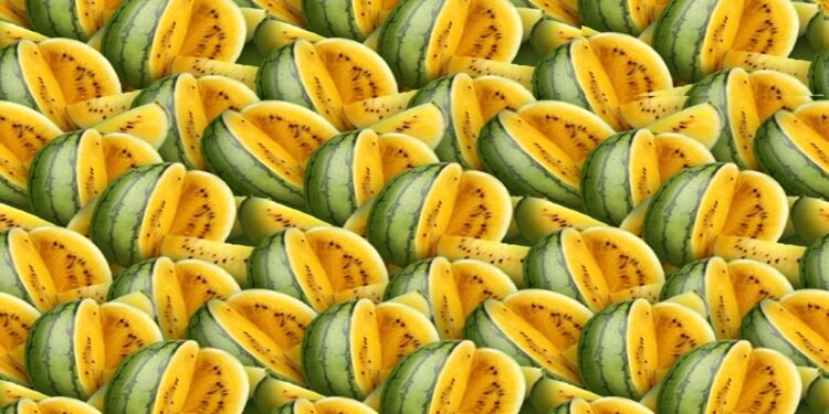 Prepare-se para o desafio de hoje que vai testar sua percepção! A imagem mostra diversas fatias de melancia amarela com casca verde, organizadas de forma a criar um padrão visual repetitivo, realçando a textura e as sementes da fruta em tons de amarelo e verde.
