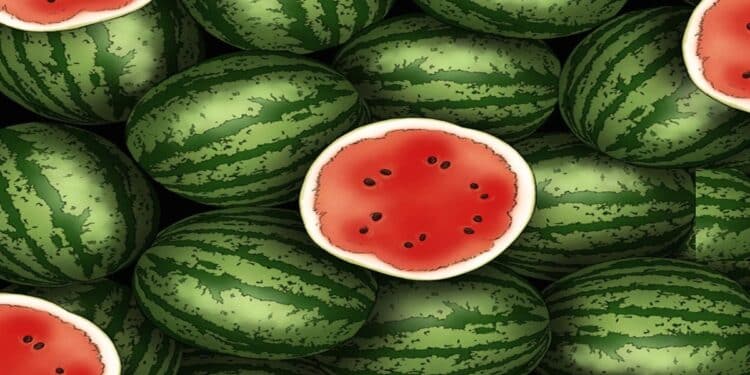 Prepare-se para o desafio de hoje que vai testar sua percepção! Observe com bastante atenção a imagem de várias melancias inteiras sobrepostas, intercaladas com melancias cortadas ao meio que exibem sua polpa vermelha, repleta de sementes pretas.