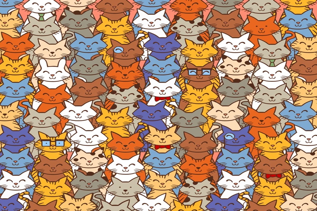Prepare-se para um novo desafio que vai avaliar sua atenção. Observe a imagem que apresenta um padrão de gatos desenhados em estilo animado, com cores variadas como laranja, azul, amarelo e marrom. Os gatos exibem óculos, gravatas e outros acessórios, criando um visual divertido. Encontre o coelho escondido na imagem em até 15 segundos.