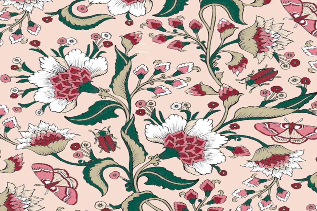 Prepare-se para um novo desafio que vai avaliar sua atenção. Veja a imagem de uma estampa floral em estilo vintage, formada por grandes flores coloridas, folhas com detalhes e pequenos insetos, como borboletas e besouros.