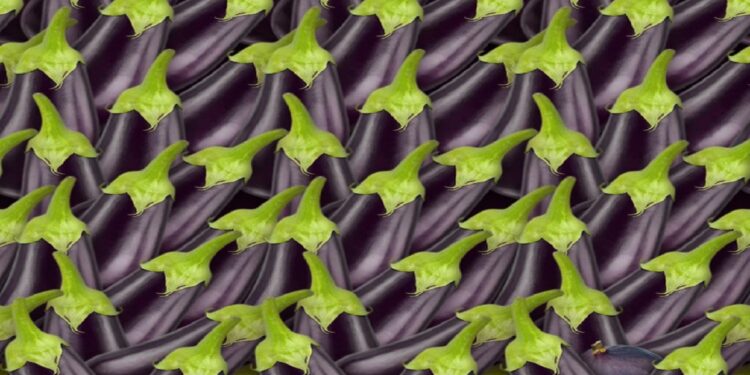 Prepare-se para o desafio de hoje que vai testar sua percepção! Observe com bastante atenção a imagem que mostra várias berinjelas roxas dispostas lado a lado, com seus cabos verdes destacados, evidenciando a qualidade do vegetal.