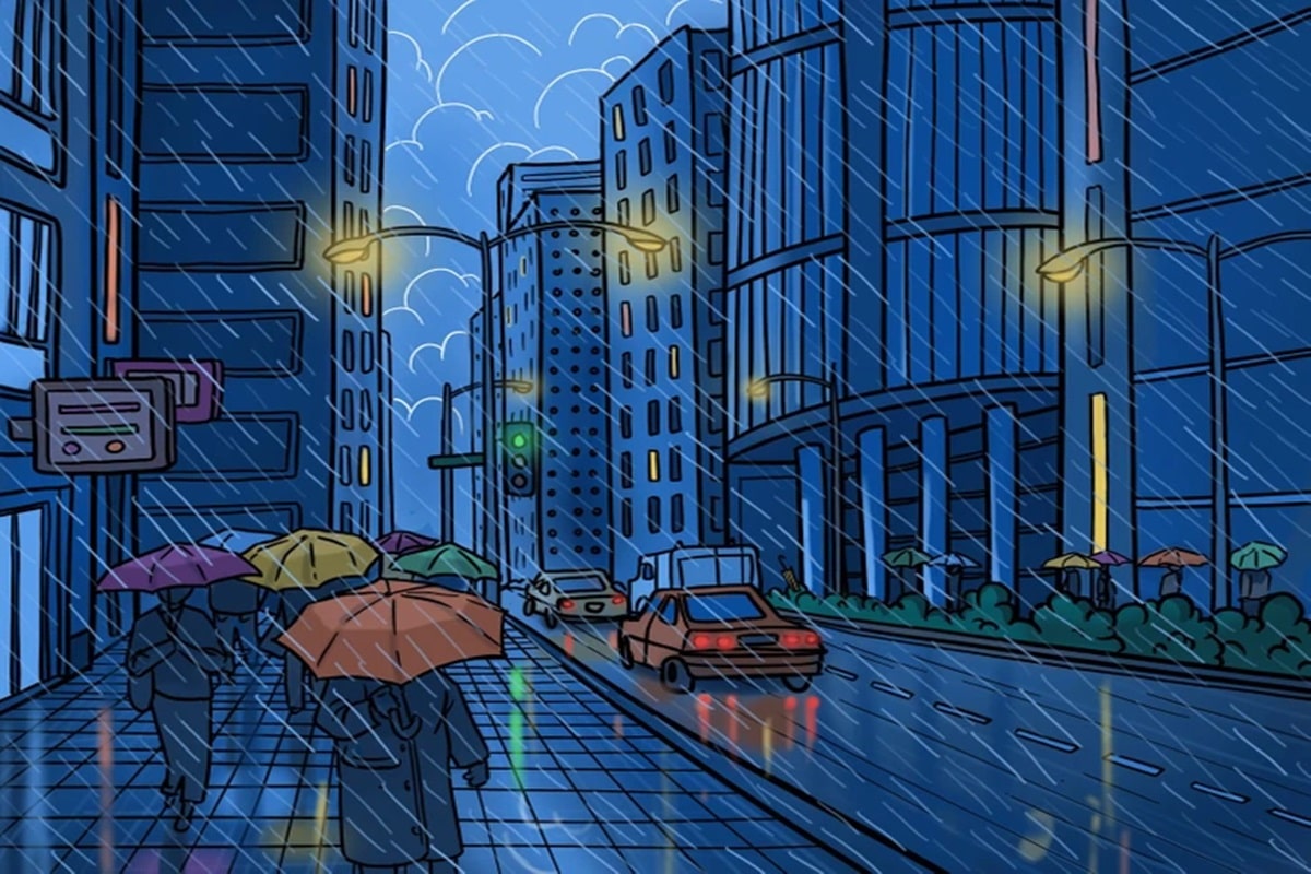 Prepare-se para o desafio de hoje que vai testar sua percepção! Veja uma ilustração detalhada de uma rua urbana à noite sob uma forte chuva. Pessoas caminham pela calçada com guarda-chuvas coloridos, enquanto carros trafegam pela rua encharcada, refletindo as luzes dos postes e dos veículos.