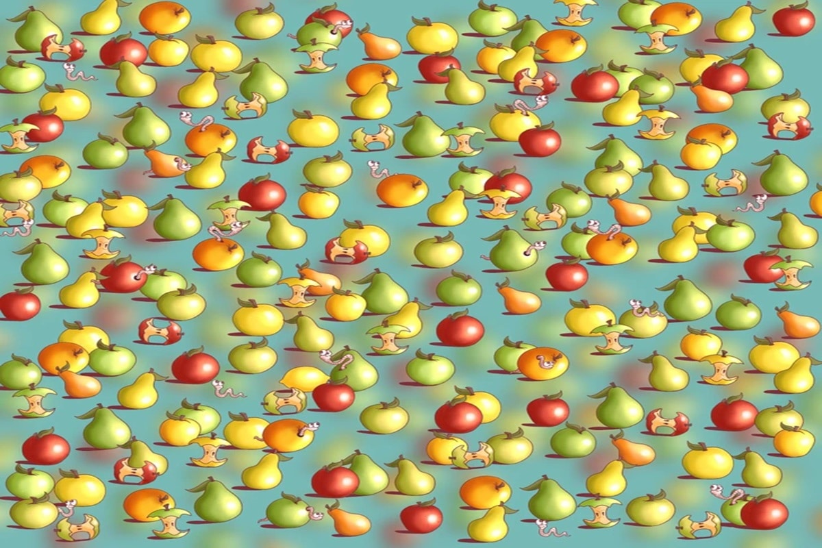 Prepare-se para o desafio de hoje que vai testar sua percepção! A imagem apresenta uma ilustração colorida onde várias frutas, como maçãs e peras, estão distribuídas sobre um fundo claro. Algumas maçãs estão mordidas, e minhocas animadas aparecem saindo das frutas. Você consegue encontrar em até 25 segundos a cereja camuflada nesta imagem?