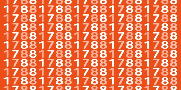 Prepare-se para o desafio de hoje que vai testar sua percepção! Uma imagem que exibe repetidamente o grupo de números 1, 7, 8, 8 em padrões brancos e tom laranja fortes. O desafio visual consiste em localizar o número 1785 escondido entre esses números similares, num fundo laranja. Você consegue encontrar em até 20 segundos o número 1785 camuflado entre os números 1788 nesta imagem?