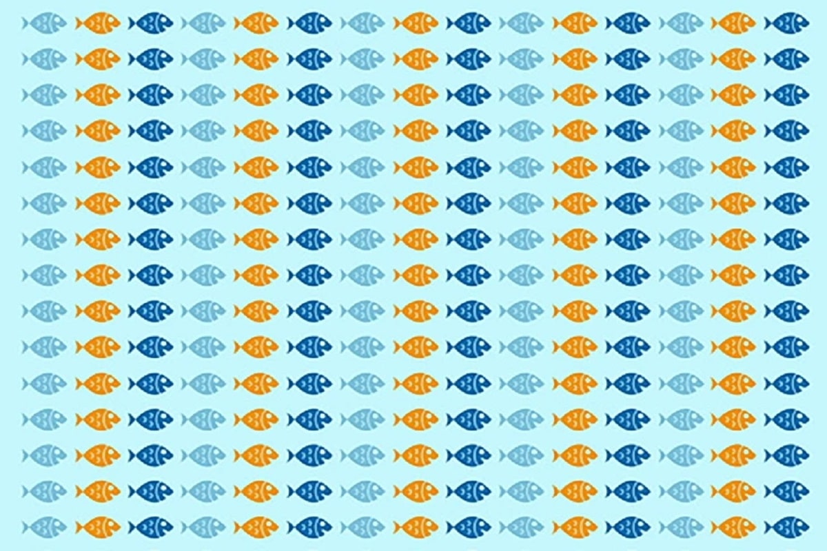 Prepare-se para um novo desafio que vai avaliar sua atenção. Observe a imagem com um padrão de peixes nas cores azul-claro, azul-escuro e laranja, organizados em linhas horizontais sobre um fundo branco. Encontre o peixe que nada na direção oposta em até 10 segundos.