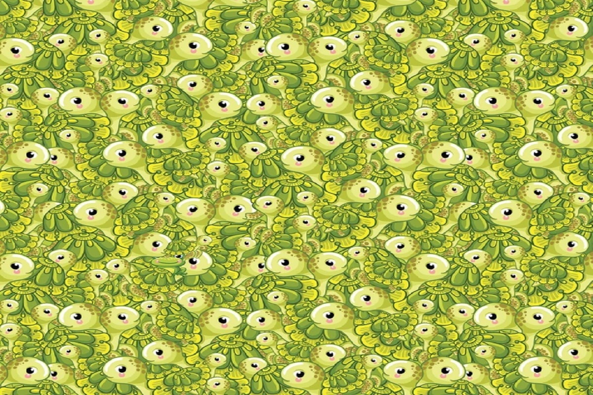 Prepare-se para o desafio de hoje que vai testar sua percepção! Observe a imagem que mostra um padrão contínuo de tartarugas-verdes, cada uma com grandes olhos. O desafio é encontrar o sapo em até 25 segundos.