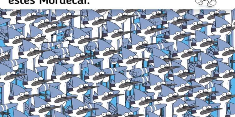Prepare-se para um novo desafio que vai avaliar sua atenção. Observe a imagem de desafio visual que mostra diversas figuras do personagem Mordecai em tons de azul, com um Smurf escondido entre eles.