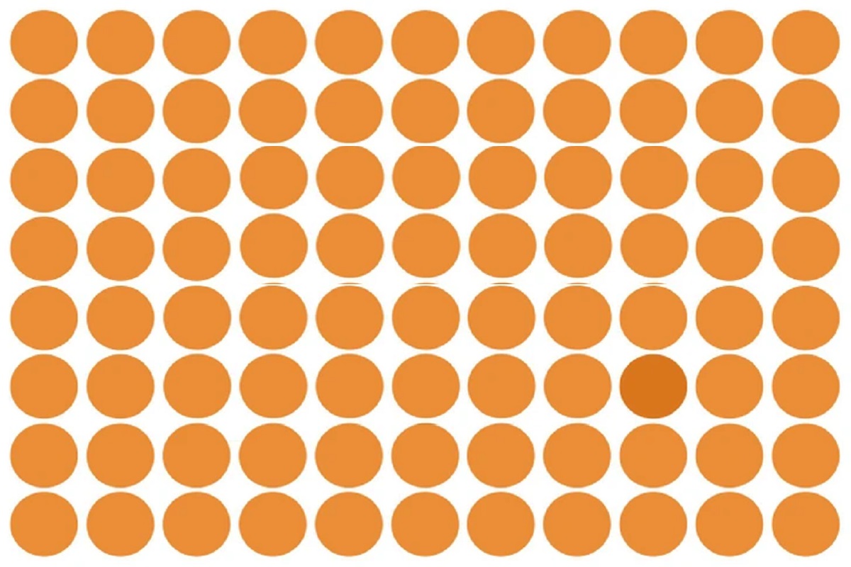 Prepare-se para um novo desafio que vai avaliar sua atenção. A imagem que mostra linhas de círculos laranja, alguns mais escuros, formando um padrão geométrico. O objetivo é encontrar o triângulo camuflado entre os círculos em até 30 segundos.