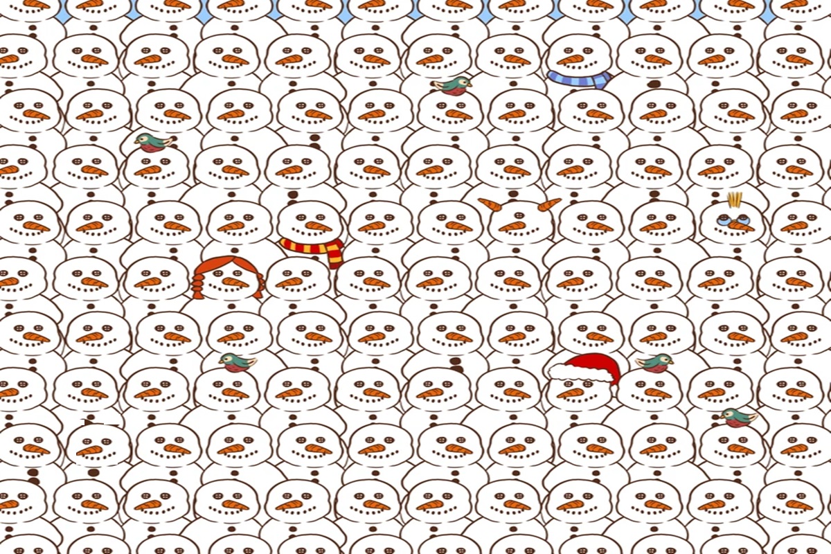 Prepare-se para um novo desafio que vai avaliar sua atenção. Na imagem, vemos uma diversos bonecos de neve organizados em fileiras. O desafio, é encontrar um urso panda oculto entre eles em até 30 segundos.