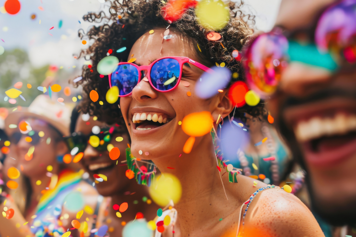 Mulher sorridente usa óculos rosa em meio a confetes coloridos durante bloco de Carnaval