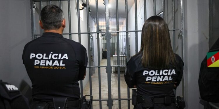 Dois agentes da Polícia Penal do Rio Grande do Sul de costas em frente a grades de unidade prisional