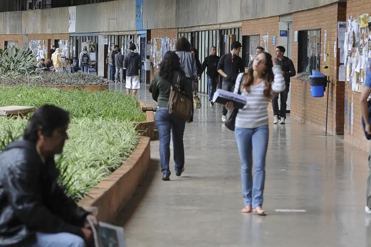 Jovens caminham e conversam em corredor amplo com jardins internos e murais repletos de avisos