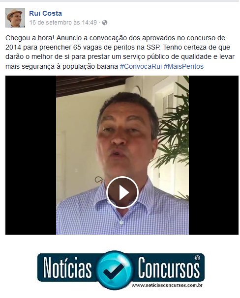 O Governador do Estado da Bahia, Rui Costa, anunciou a convocação de 65 aprovados no último concurso para Perito da Polícia Técnica. Desse total, 23 são para o cargo de perito criminalístico, 25 para perito médico-legal e 17 para perito técnico de Polícia Civil. “A partir do dia 26 de setembro, você que fez o concurso da Polícia Técnico do Estado, para Perito, poderá entregar a sua documentação”, disse o Governador em vídeo publicado em sua página oficial no Facebook (veja abaixo).