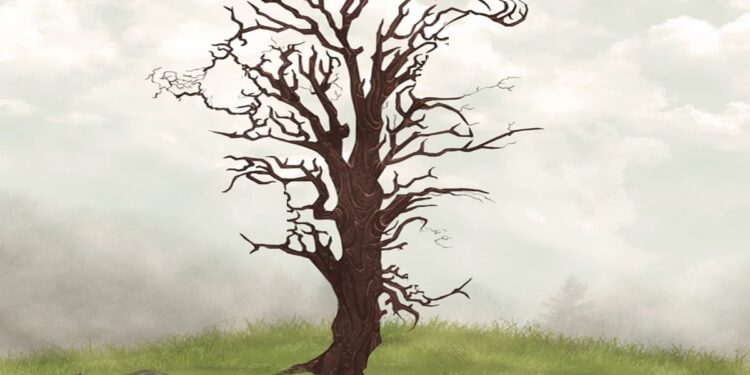 Prepare-se para o desafio de hoje que vai testar sua percepção! Observe com bastante atenção a imagem artística mostrando uma árvore seca cujos galhos delineiam rostos humanos, situada em um campo verde com céu nublado e neblina ao fundo.
