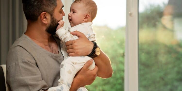 Pai segurando e beijando recém-nascido, ilustrando a relação de afeto e a importância da licença-paternidade para o vínculo familiar.
