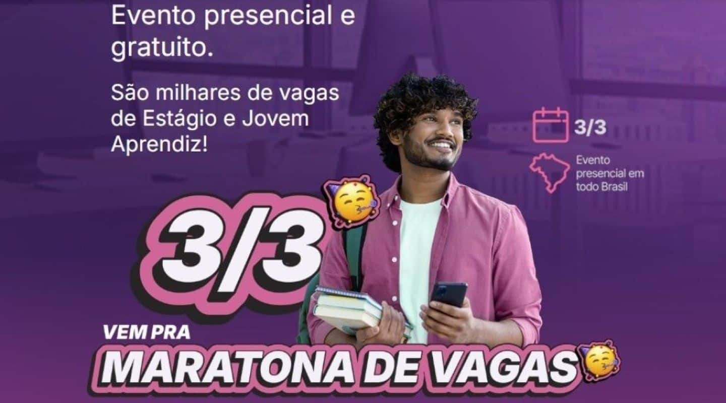 A maratona de vagas é um evento presencial organizado pelo CIEE em comemoração aos seus 62 anos de atuação. Em 2026, a ação acontece simultaneamente em mais de 90 unidades espalhadas pelo Brasil, com mais de 14 mil oportunidades no total — entre estágio e Jovem Aprendiz.
