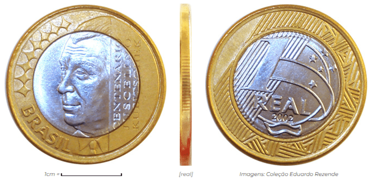 Lançada em 2002, a moeda de 1 real em homenagem a Juscelino Kubitschek comemora o centenário do ex-presidente do Brasil. Com tiragem de 50 milhões de unidades, ainda circula com frequência no troco, porém poucas estão em ótimo estado para colecionadores. Suas especificações ajudam a diferenciar falsificações e identificar exemplares raros:
