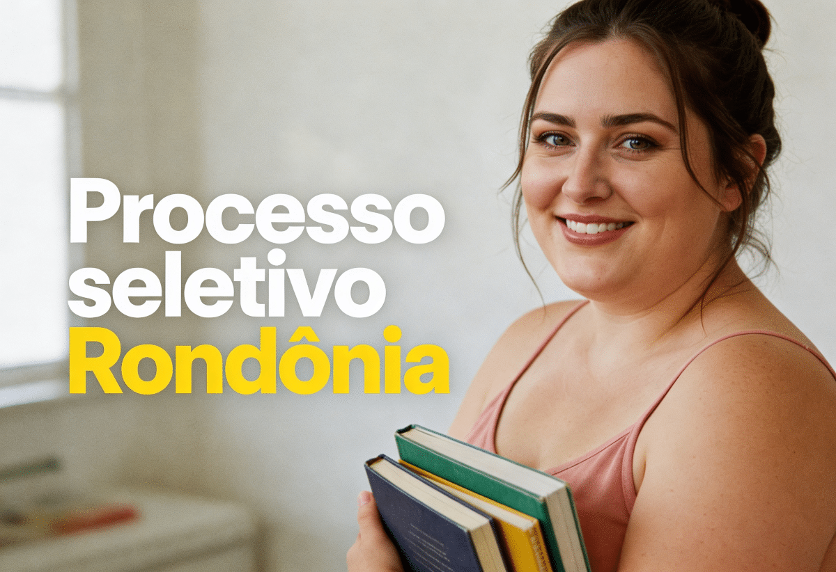 Jovem mulher sorridente segurando livros coloridos com texto "Processo seletivo Rondônia" sobreposto.
