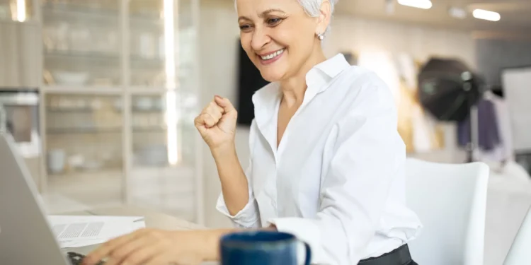 Mulher madura sorrindo enquanto trabalha no notebook, representando nova fase profissional após os 40 anos.