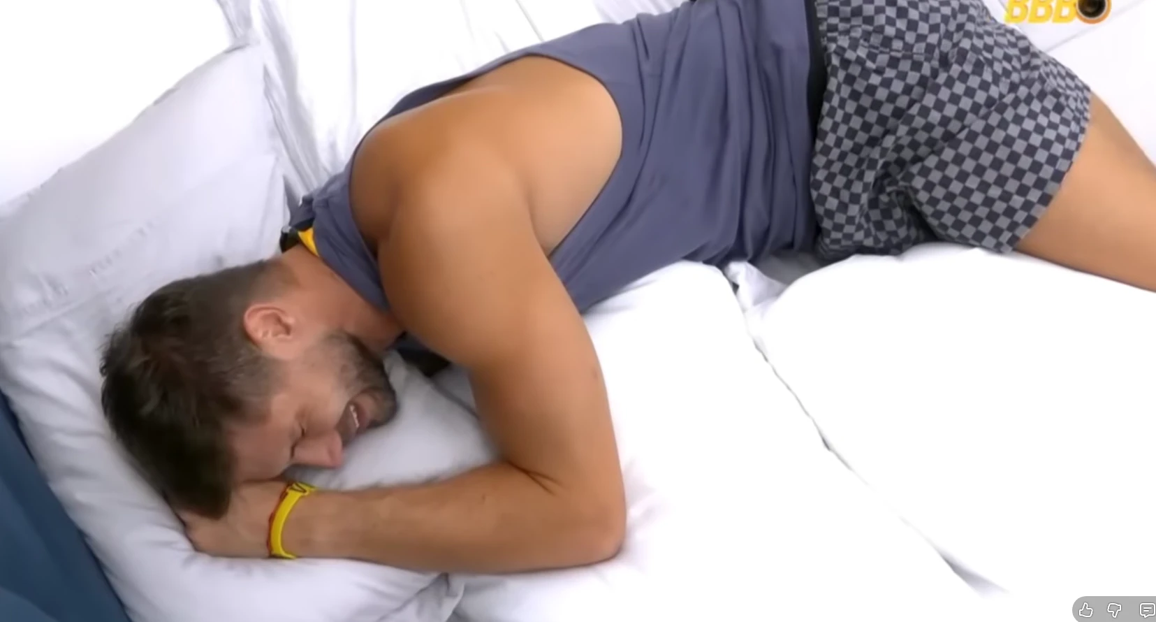 Jonas deitado na cama chorando sozinho no Quarto do Líder após a saída de Sarah no BBB.