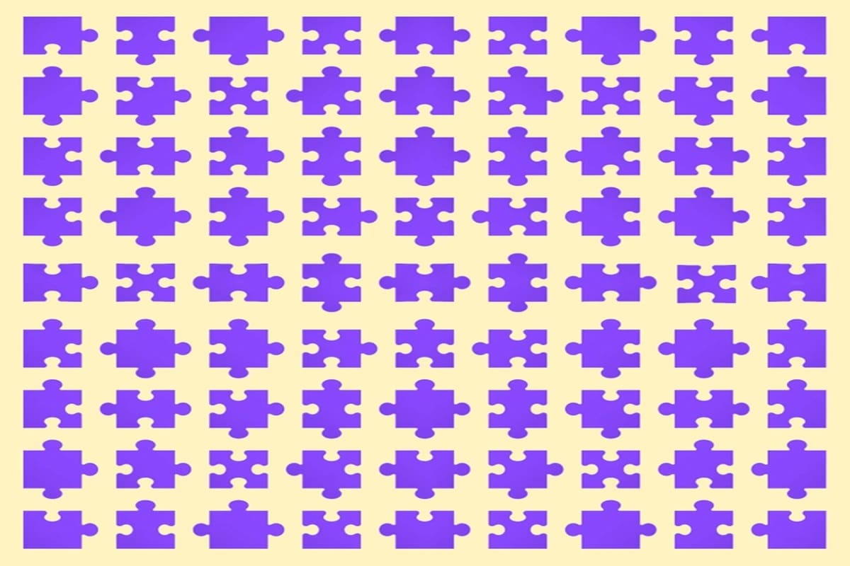 Prepare-se para o desafio de hoje que vai testar sua percepção! A imagem apresenta diversas peças roxas de quebra-cabeça dispostas em fileiras sobre um fundo amarelo-claro. As formas distintas de cada peça indicam que elas podem se conectar, criando um padrão visual. Você consegue encontrar em até 20 segundos qual das peças não se encaixa nesta imagem?