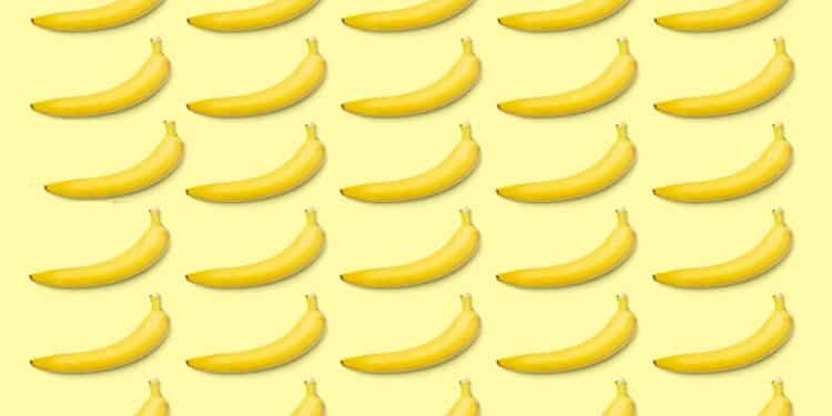 Prepare-se para o desafio de hoje que vai testar sua percepção! Observe a imagem com várias bananas organizadas em linhas regulares sobre um fundo amarelo claro, criando um impacto visual de repetição e simetria.