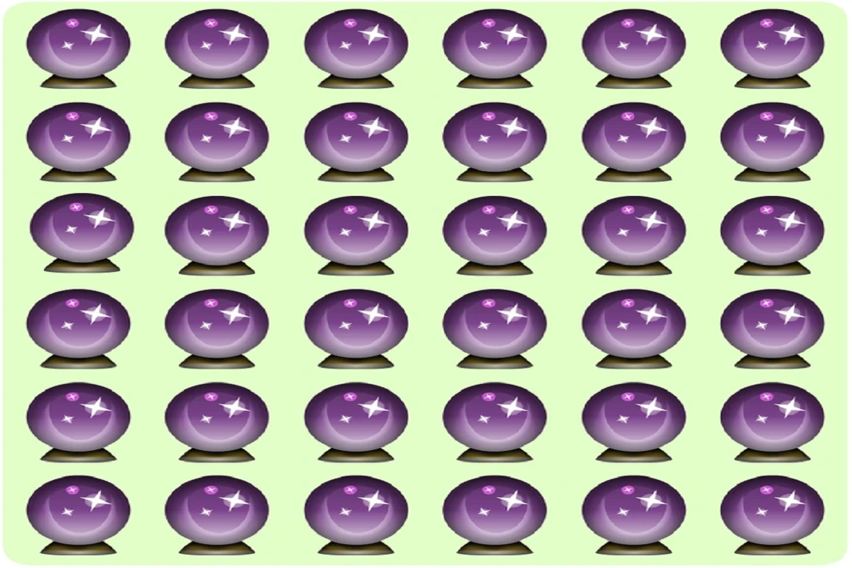 Prepare-se para um novo desafio visual que vai avaliar sua atenção. A imagem retrata o desafio visual “encontre a bola de cristal diferente entre várias bolas de cristal”. São 24 bolas de cristal roxas em linhas e colunas uniformes sobre fundo verde-claro, sendo uma delas distinta para testar atenção visual. Você terá o tempo limite de até 20 segundos para encontrar a bola de cristal fora do padrão.