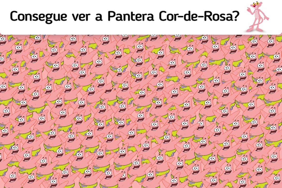 Prepare-se para um novo desafio que vai avaliar sua atenção. Observe a imagem que traz um enigma visual, onde a Pantera Cor-de-Rosa está oculta entre diversas ilustrações do personagem Patrick Estrela.