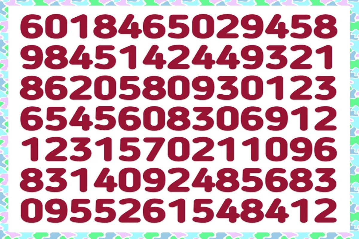 Teste visual com números grandes e aleatórios organizados em linhas sobre fundo colorido pastel.