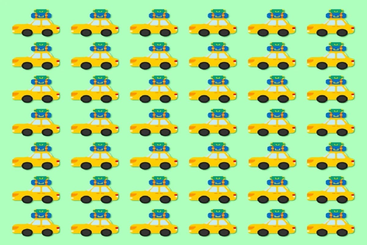 Prepare-se para o desafio de hoje que vai testar sua percepção! Esta imagem mostra um padrão repetitivo de carros amarelos com malas azuis no teto, organizados em linhas sobre um fundo verde. O desafio é identificar o carro que está indo na direção contrária. Você terá até 20 segundos.