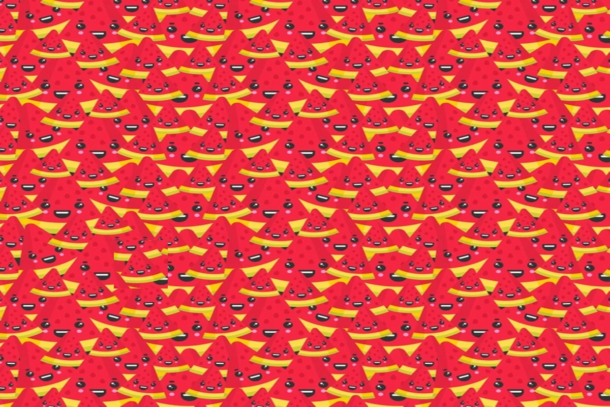 Prepare-se para o desafio de hoje que vai testar sua percepção! Observe a imagem formada por fatias de melancia vermelha com rostos sorridentes. Cada pedaço traz detalhes em amarelo e preto para representar as sementes e a casca.