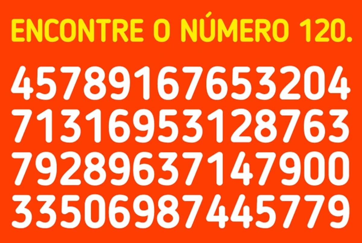 Prepare-se para o desafio de hoje que vai testar sua percepção! Observe com bastante atenção a imagem em que vários números são exibidos em branco sobre um fundo vermelho, com a instrução em amarelo para encontrar o número 120.