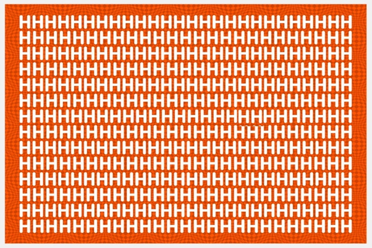 Prepare-se para o desafio de hoje que vai testar sua percepção! Analise a imagem que apresenta um desafio visual clássico: encontrar em até 15 segundos o número 4 escondido entre um conjunto de letras H brancas. Todas as letras estão organizadas sobre um fundo em tom laranja forte. O objetivo é identificar rapidamente o número neste padrão repetitivo.