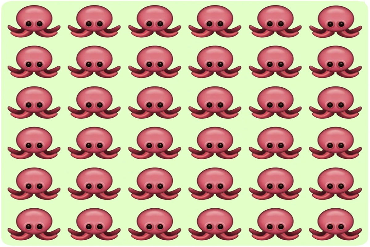 Prepare-se para um novo desafio visual que vai avaliar sua atenção. A imagem apresenta dezenas de emojis de polvo idênticos em uma grade com fundo verde-claro, exceto um polvo. O seu desafio é encontrar o polvo diferente em até 20 segundos.
