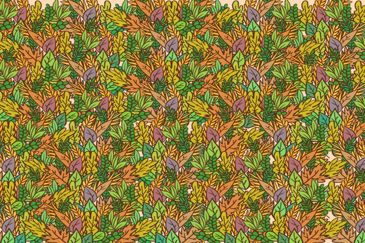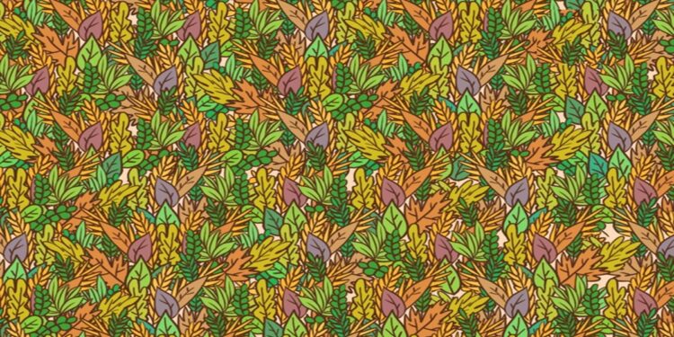 Prepare-se para um novo desafio que vai avaliar sua atenção. A imagem mostra um fundo coberto por folhas desenhadas à mão, nos tons típicos do outono, como laranja, amarelo, verde e marrom. O desafio é encontrar um sapo mestre em camuflagem em até 25 segundos.