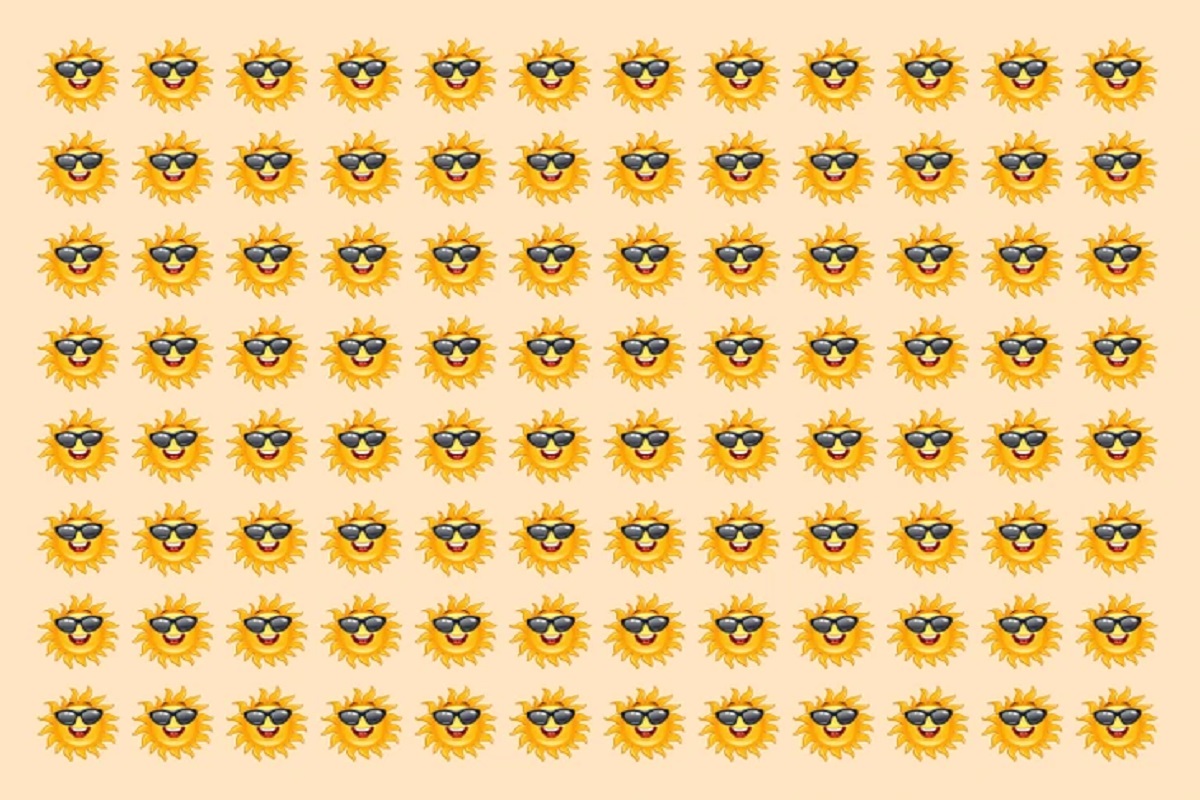 Prepare-se para o desafio de hoje que vai testar sua percepção! Analise a imagem que apresenta uma repetição ordenada de emojis de sol amarelo, todos usando óculos escuros e com sorriso, organizados sobre um fundo bege. O objetivo é identificar o único sol fora do padrão em até 20 segundos.