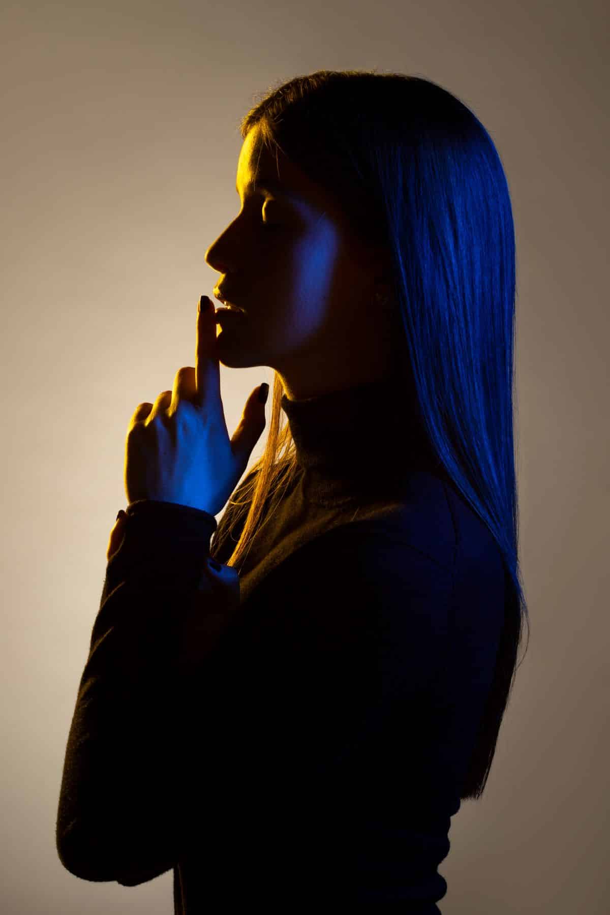 Tudo começa pelo jogo de luzes no retrato. O contraluz quente ilumina o cabelo e os contornos, enquanto uma luz fria, geralmente azul ou verde, realça os traços do rosto. O fundo totalmente escuro contribui para destacar as formas e dar aquele ar misterioso e sofisticado.